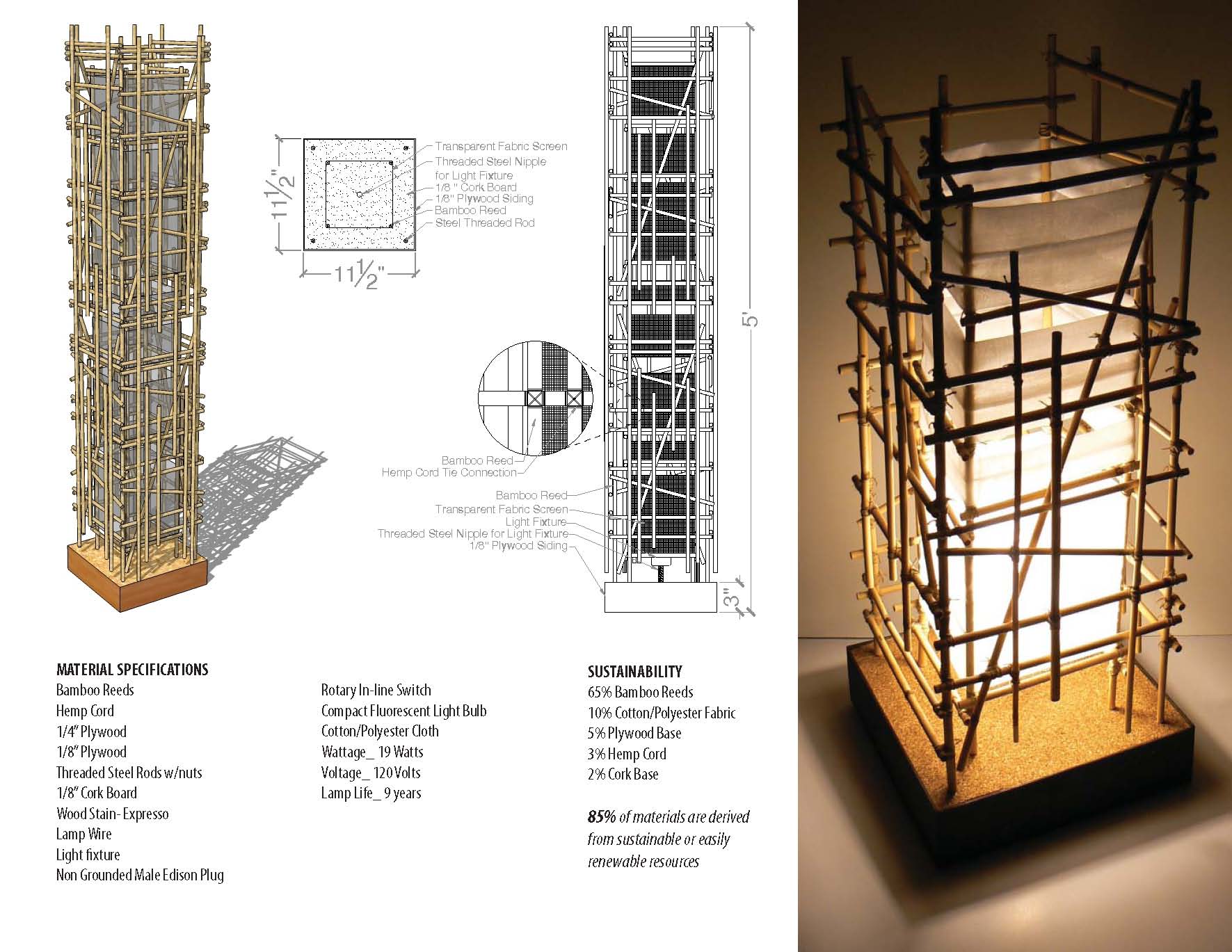DESCRIPTION: We’ve all seen them: the 300w halogen torchiere floor lamp, a fixture common in dorm rooms and homes all over the world. Why build a better torchiere? The answer is simple. As the world energy demand increases, sustainable and energy efficient lighting is required. ECO_plexity is the new and and improved torchiere lamp. A design inspired from the tropical bamboo forests of Hawaii, this lamp uses a double skin system to filter its light. The energy efficient design uses a 19 watt Compact Flourescent Bulb (CFL) instead of the typical 300 watt halogen bulb that normally accompanies torchiere lamps. This simple feature can save on average around 80 kWh per year. Over the lifespan of the CFL bulb this lamp can save over 720 kWh of energy, or roughly $100, and prevent as much as 1,140 lbs of greenhouse gases! Not only is energy efficiency a focus, but 85% of the lamps materials are derived from sustainable or easily renewable resources. ECO_plexity is our green solution to a new torchiere lamp.