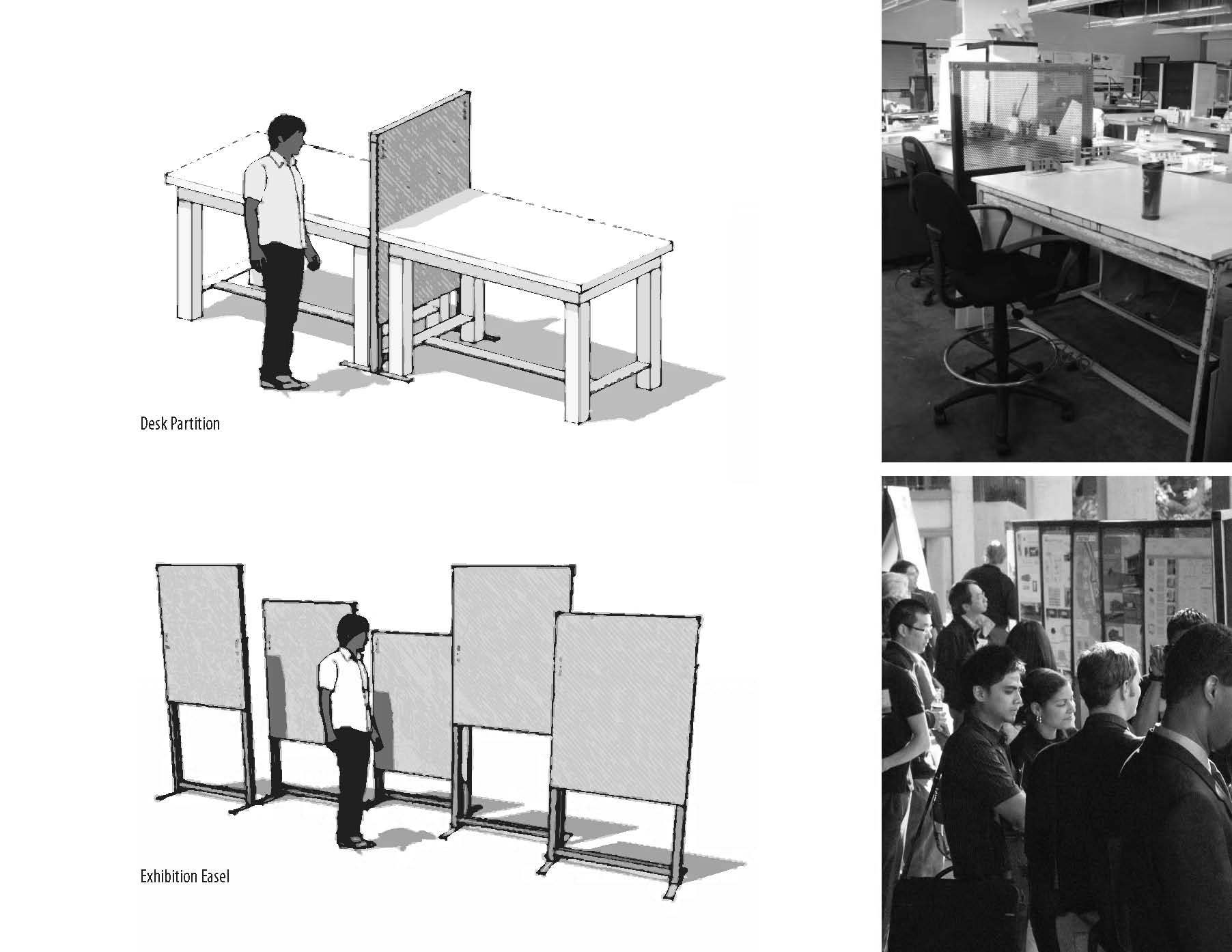 DESCRIPTION: Flexibility is key when it comes to furniture for a school of architecture. In preparation for BESS 2010, the High Performance Building Enclosures Practical Sustainability Symposium, the design of this easel is purposefully multi-functional. The design consists of two interlocking frames that slide together, providing the easel with adjustable heights that can suit a variety of purposes. It can perform as a poster stand, a pinup wall for design exhibitions as well as a desk partition for architecture students. The design and specifications of the BESS Easel were used by the Building Construction course. The easel allowed undergraduate architecture students to learn steel construction fabrication techniques. In total, 17 units were fabricated by the class and are currently being utilized in the Interim Design Center for both desk partitions and design exhibitions.