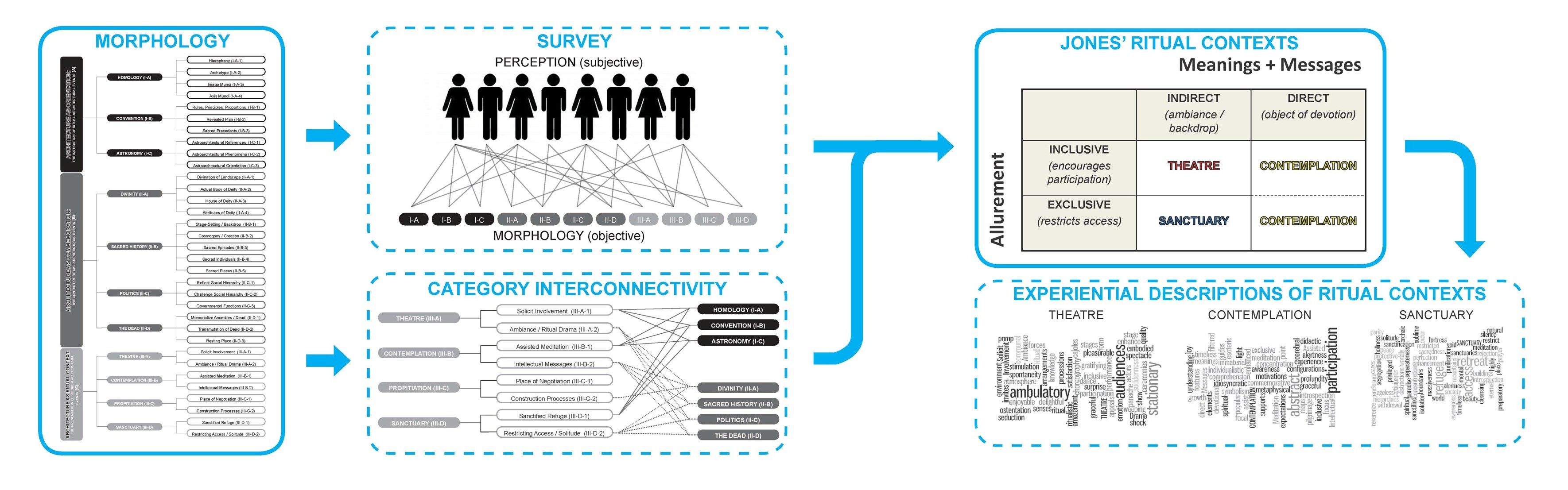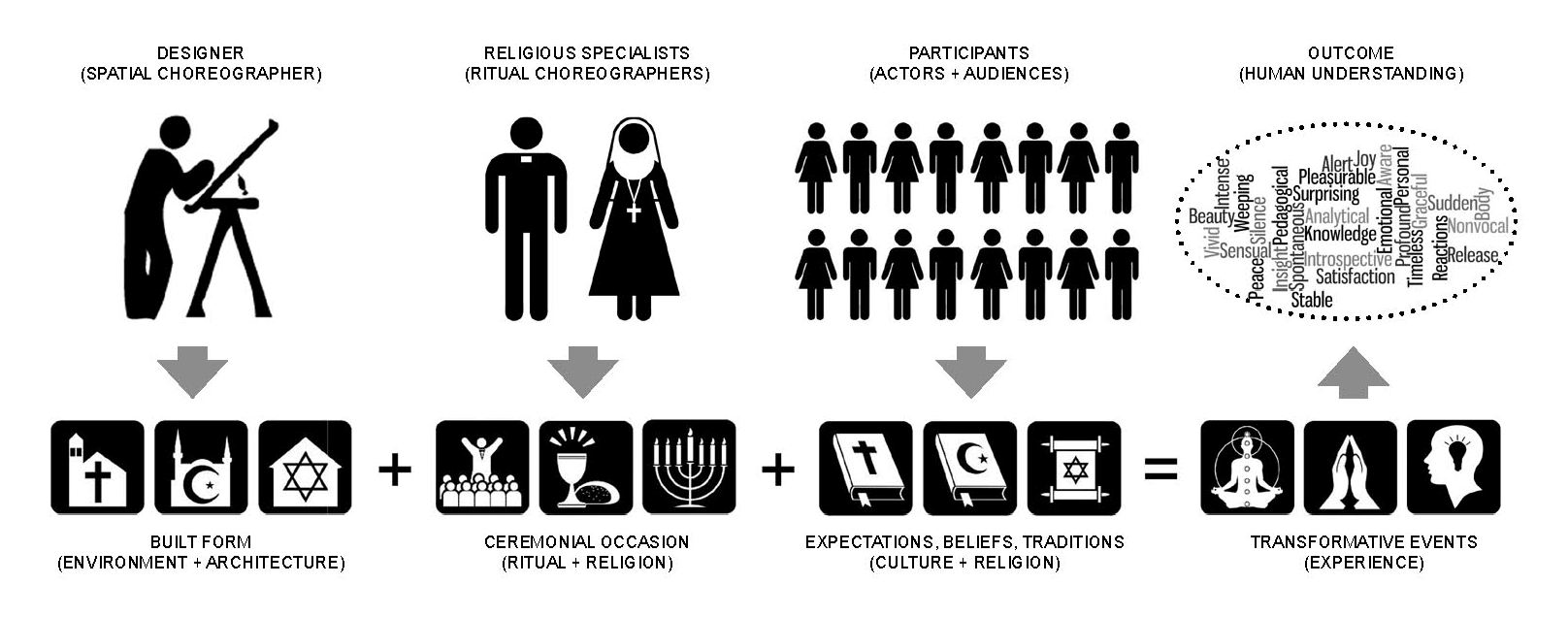 The purpose of this research is to expand the knowledge of sacred architecture by bridging the gap between the “subjective” phenomenology of human experience and architecture’s “objective” built conditions. The research employs mixed methods of quantitative and qualitative analysis of survey data as well as graphical analysis of specific case studies. The analyses from these methods demonstrate the importance, relevance, and compatibility of Lindsay Jones’ conceptual model or “morphology of ritual architectural priorities” when (re)designing sacred spaces.