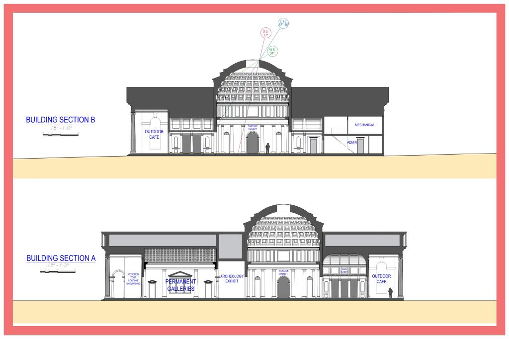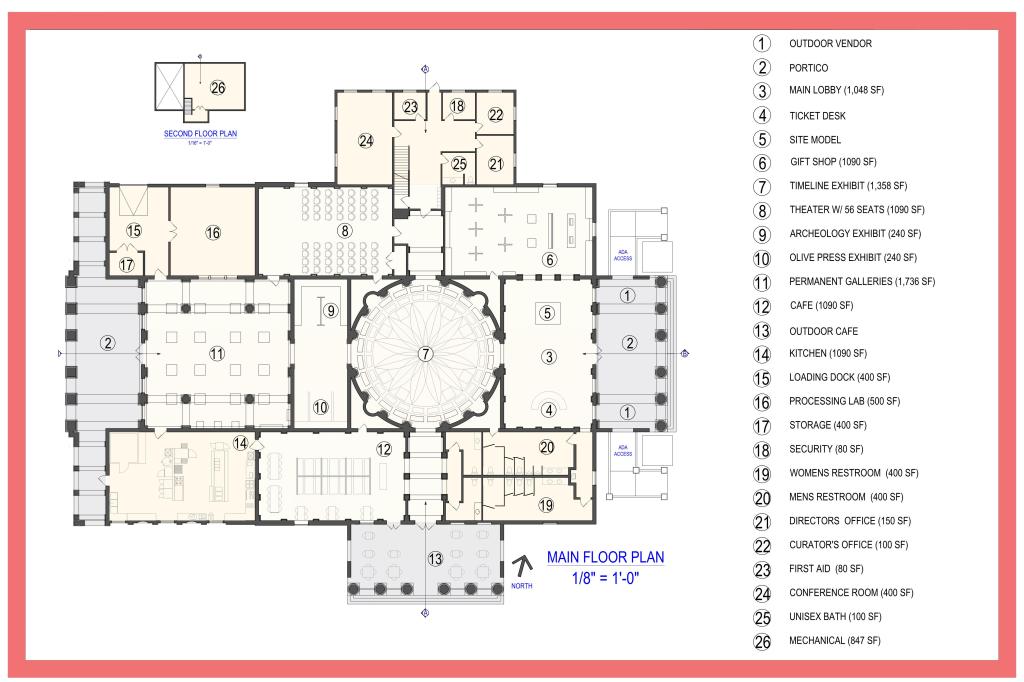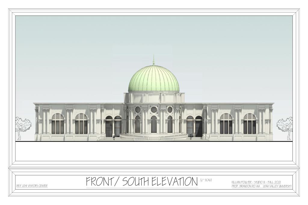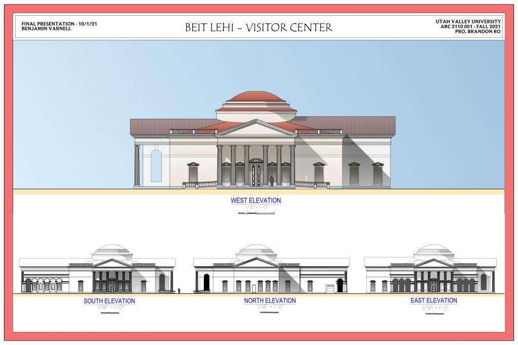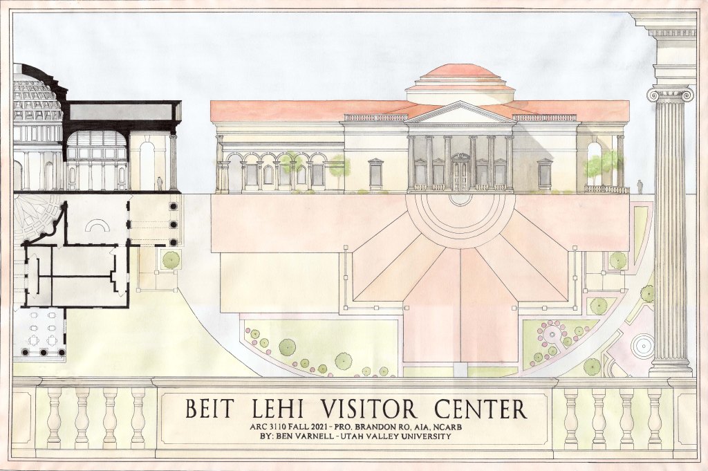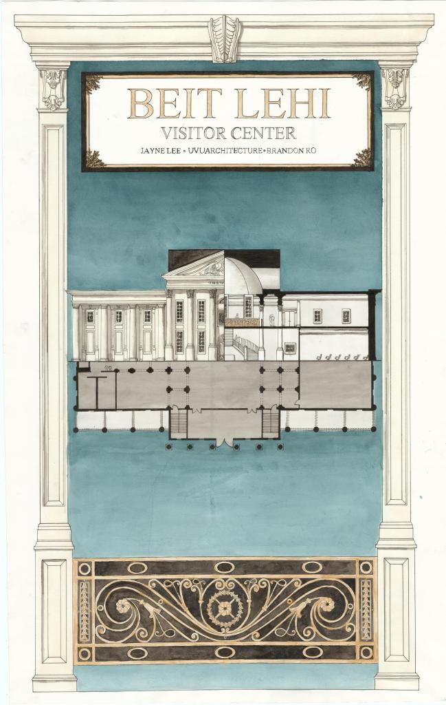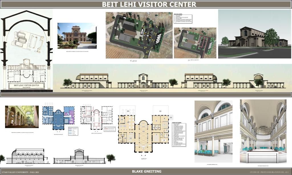 Below are examples of several student design projects from ARC 3110 – Architecture Design Studio III which was taught at Utah Valley University during the Fall 2021 semester. The 15,000-square-foot Beit Lehi Visitor Center serves as both an educational center and a gateway for tourists. The larger Beit Lehi archaeological site is located an hour southwest of Jerusalem. The design includes a public reception area, exhibits, gift shop, cafe, and theater spaces as well as a back-of-house administration area and processing lab for cataloging artifacts found on site.