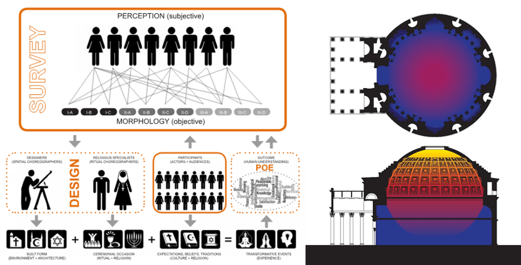 ABSTRACT: This paper seeks to create a comparative framework for evaluating transformative experiences for different types of ritual contexts found in sacred architecture by bridging the gap between the phenomenology of human experience and architecture’s built conditions. The methodology creates a framework for statistical analysis, whereby evidence of people’s actual (i.e., real, lived) “subjective” experiences can be evaluated against the “objective” architectural conditions. The comparative framework is put to the test by comparing the experiential and environmental conditions found at the Pantheon in Rome. Experiential data for the Pantheon is extracted from Julio Bermudez’s large survey database (N = 2872) of “extraordinary architectural experiences” for this study. This data is compared against “objective” graphical architecture analysis using Lindsay Jones’ “morphology of ritual-architectural priorities” with a specific focus on ritual contexts. The quantitative and qualitative data reveals that the Pantheon produces transformative experiences for visitors that are related to the expected outcomes of specific design features. The percentages from the “objective” and “subjective” analysis both rank the priorities of theatre, contemplation, and sanctuary in the same order. This study concludes that built environments possessing a higher presence and quality of “ritual-architectural priorities” are more likely to be perceived as sacred and produce transformative experiences.