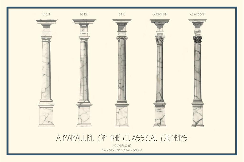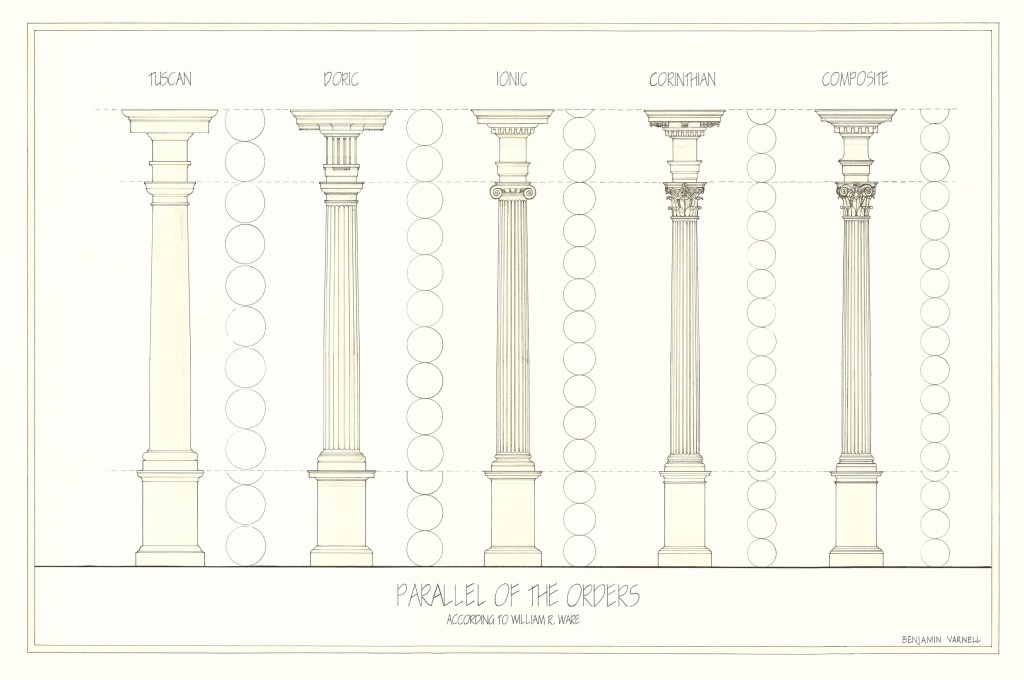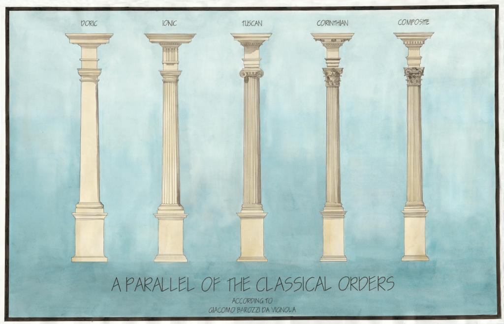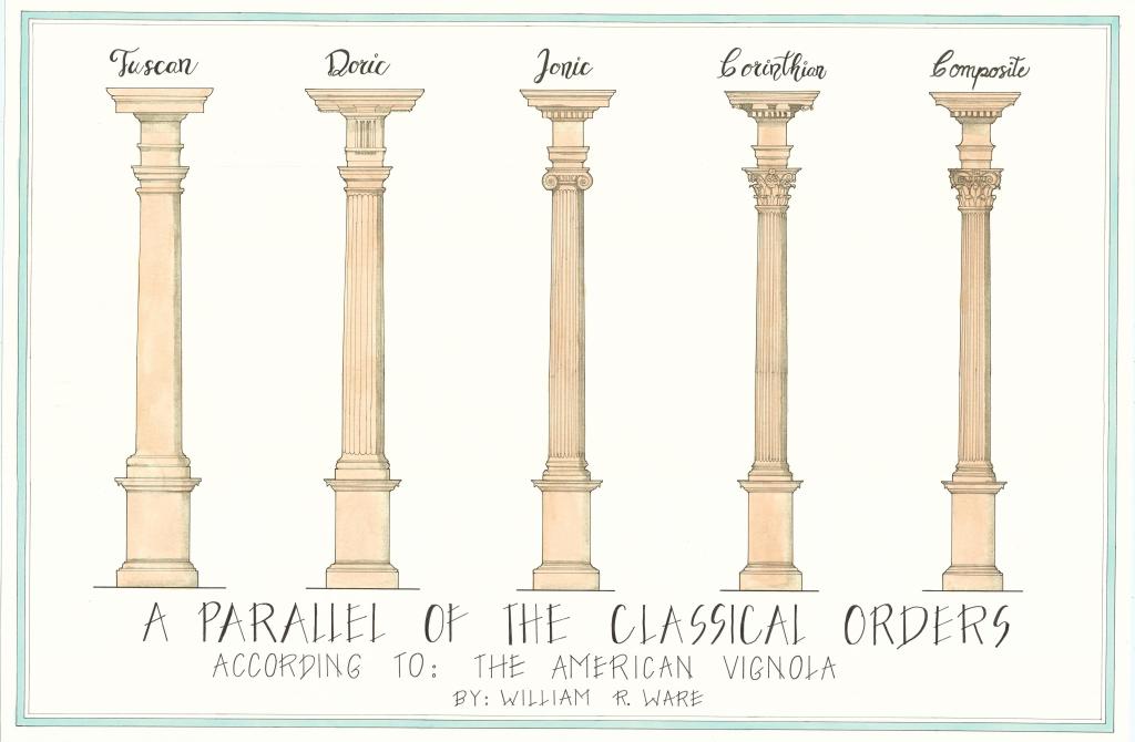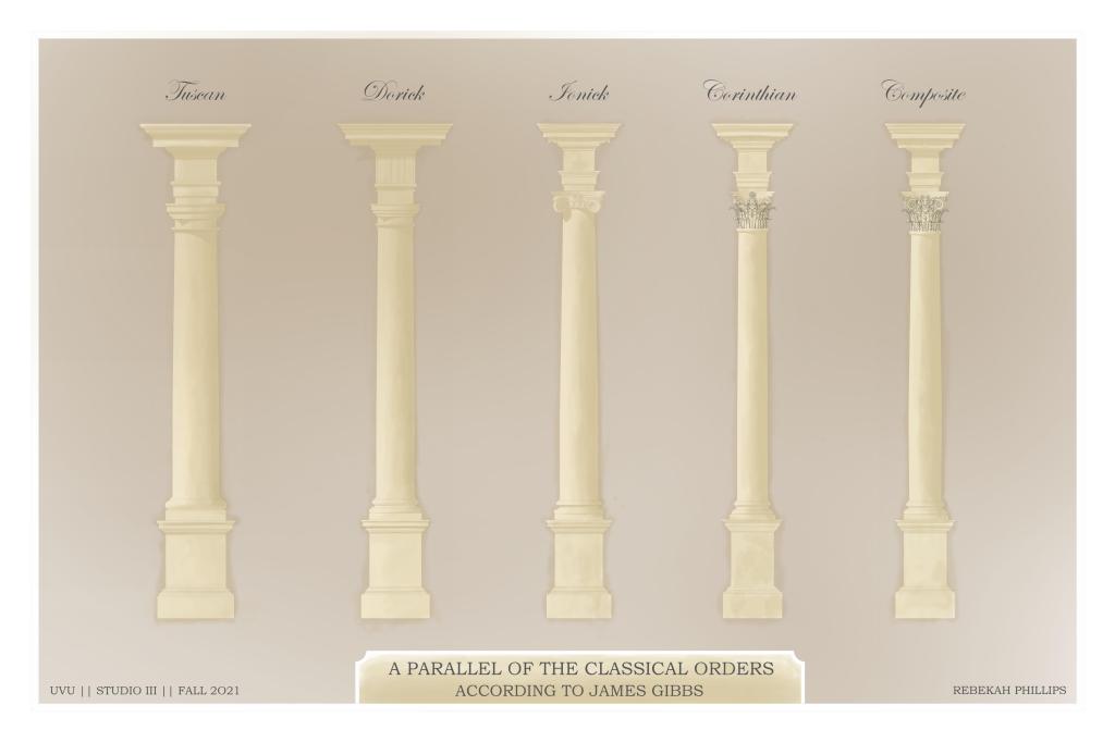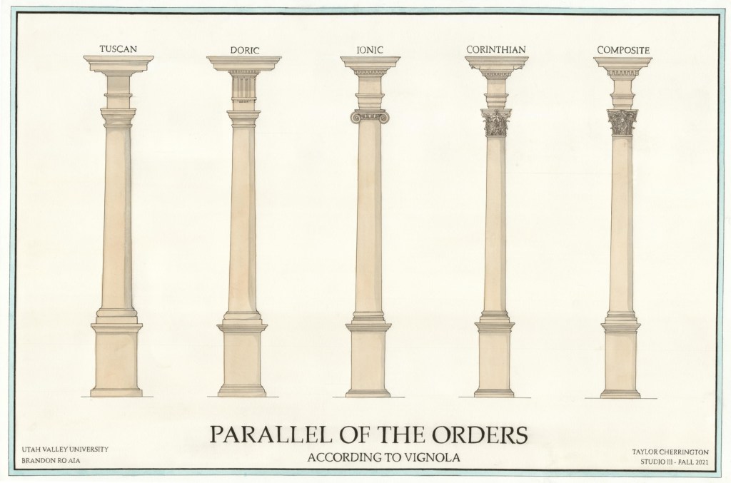 Below are examples of parallels of the classical orders. This includes versions that were produced by hand drafting and watercolor as well as digitally drafted and digitally watercolored. These were created by my students enrolled in ARC 3120 – Architectural Graphic Communication. This course was taught at Utah Valley University during the Fall 2021 and Fall 2022 semesters.